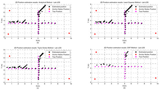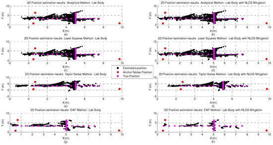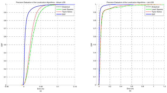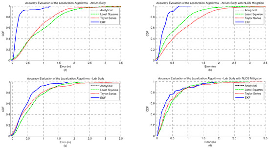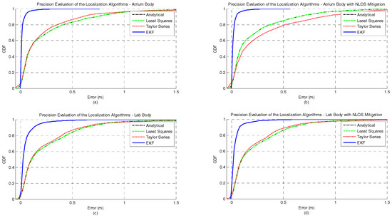 Regarding the NLOS mitigation algorithm proposed, we can see that the overall performance of all algorithms was improved. The only exception occurred for the EKF method in the lab scenario, which can be explained by the used noise statistics. The noise statistics were obtained from the tests carried out in an open free space, which do not corresponds with the propagation conditions of the lab scenario. If the noise statistics of the lab scenario were used, a performance improvement is expected for the EKF method. However, this will make the performance of the IPS highly dependent on the lab scenario and this scenario does not represent all the propagation conditions for indoor environments, making the system scenario-dependent and, therefore, it does not comply with the emergency responders’ requirements. Although the accuracy of all methods is improved by running the NLOs mitigation algorithm—especially for the methods that do not use noise statistics—is the precision that is significantly improved (up to 50%).