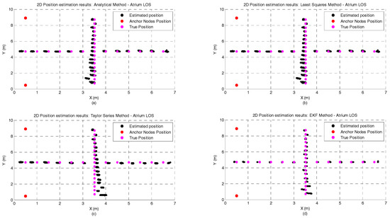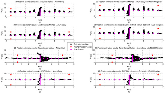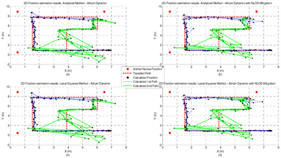 Immunity to Environment-Related Perturbations—the performance of the system must be independent of the scenario, so the positioning algorithms are tested under different scenarios (atrium and lab), propagation conditions (LOS and NLOS due to a human body) and movement (static and dynamic). In other words, we want to evaluate which positioning algorithm presents higher immunity to noisy measurements and, therefore, is more likely to provide a robust position estimation under the different propagation conditions of indoor environments. The performance of the localization algorithms is also compared after running a NLOS identification and error mitigation algorithm developed for the NLOS caused by the human body. This method proved to be an effective way to improve the performance of all algorithm under NLOS condition.