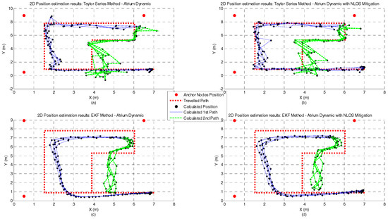 41], during emergency responders’ missions the availability of radio signals is generally low. This happens due to the following reasons: no reliable infrastructure exists in a building capable of computing the emergency responders’ position, the deployment cannot interfere with the emergency responder’s activities, the low penetration capability of UWB signals in indoor environments (up to 40 m in NLOS scenarios), and the risk of some anchor nodes being destroyed by the fire or falling debris. So, the performance (accuracy, precision and root mean square error (RMSE)) of the positioning algorithms is assessed with only three ranging measurements. This is the minimum number of measurements required to compute the user’s position;