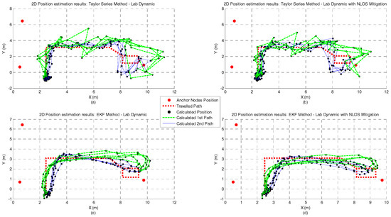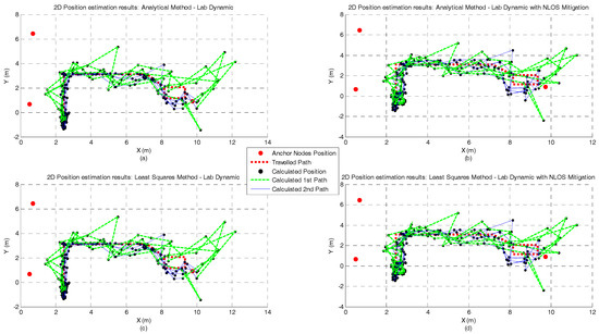 Regarding the dynamic tests, the performance of all algorithms degrades as the number of anchor nodes under NLOS condition increases. As expected, the best trajectory is provided by the EKF method, which is especially visible in the lab scenario. However, when there is only one anchor node in NLOS condition, the performance of the Analytical and the Least Squares methods outperforms the EKF method. The lower performance of the EKF when compared with the other positioning algorithms can be explained by the low position update rate of the UWB systems (between 1 and 2 Hz).