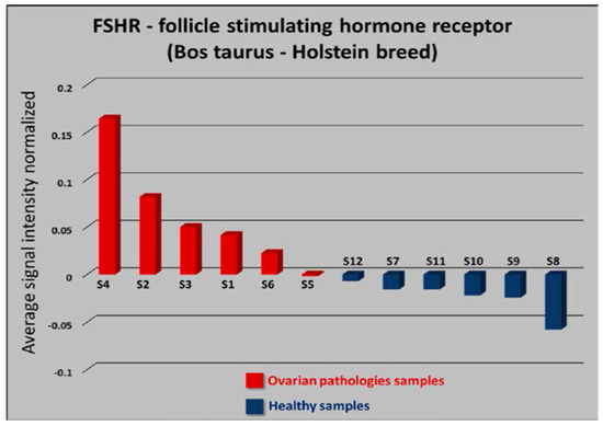 The complete list of genes in the autosomal chromosomes (approx. 35,000) were obtained from the bovine genome Bos taurus (cattle) genome viewer (release annotation 104) from NCBI Map Viewer (http://www.ncbi.nlm.nih.gov/mapview/). From this list, based on the criteria for SNP number selection for defining Structural Variations used by Salomon-Torres et al. [11], we selected the genes that had at least 15 SNPs within their DNA sequence with the purpose of increasing accuracy. As a result, 4532 genes were selected for the analysis of their signal intensity. Regarding the identified hormone genes involved in ovarian pathology processes, at least 11 were identified as highly related to ovarian diseases (see Supplementary File 1: Table S2, for a complete list). Only two genes met the criteria (≥15 SNPs): Follicle stimulating hormone receptor (FSHR) and the Luteinizing hormone/choriogonadotropin receptor (LHCGR), with 61 and 19 SNPs respectively.