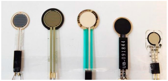 Commercially available thin and flexible piezoresistive force sensors were sourced for this study. These sensors were single-contact point force sensors, and so were able to provide a single sensing pressure output based on the area of applied load. The conductivity of these piezoresistive sensors rises with applied pressure due to increased contact between conductive particles in the polymer matrix of the sensor. The five sensors evaluated were the Peratech QTC™, FSR®, Sensitronics®, Tactilus® and Flexiforce® (Figure 1).