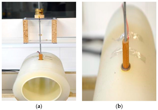 In this study, the evaluation and determination of sensor properties was performed in a manner representative of the actual pressure measurement conditions on a human leg in compression therapy, using a custom-designed instrumental setup (Figure 2a,b). To mimic the flesh of a human leg, a soft and flexible core-sheath structure was developed as the surface of the compression testing apparatus (Figure 3a).