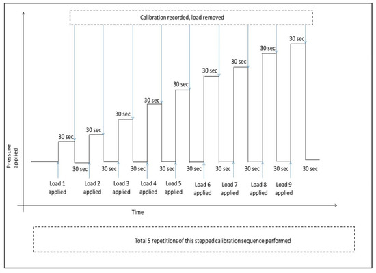 The stepped calibration procedure for raw data collection was as follows: The sensor output recording was started and data was acquired for 100 s without the load; the weight was applied on the sensor and the reference sensor voltage for the particular pressure recorded after 30 s. Then, the weight was removed for 30 s and the next sequentially stepped weight was applied for 30 s. In a real-life compression therapy scenario, a medical attendant applies the compression bandage and waits for a few seconds before noting the pressure readings, so that any variation in pressure due to changes in bandage application can be accommodated. Therefore, in this study the calibrations were recorded after 30 s. In addition, these intervals provide an important time gap for the sensors to reach a more stable condition, such that any change after this time could be attributed to drift. The whole calibration procedure for an individual sensor was repeated five times, and the software then calculated an average of these five calibration curves to give a single curve. RMIT’s customised software was programmed to automatically process this calibration data and remove outlier readings in each cycle of raw calibration file while creating the averaged calibration file for use in the pressure loading stage.
