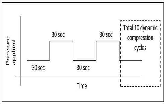 Dynamic measurements mimic short-term changes in pressure during bandage application as well as during human physical activity. The three selected pressures (30.5, 51.4 and 72.7 mmHg) were periodically applied to the sensor placed on the soft cylinder surface. The dynamic loading cycle was initiated after collecting data for noise analysis by recording the sensor output without applying any load for 100 s. This relaxed recording stage was followed by dynamic loading, involving applying a cyclic load on the sensor with a holding time at each step of 30 s and a duty cycle of 50% (period = 60 s). This cycle was repeated 10 times (Figure 5). Dynamic cyclic testing (10 cycles) was repeated three times, after full relaxation of the sample for 30 min, to determine any repeatability issues due to relaxation in the sensor.