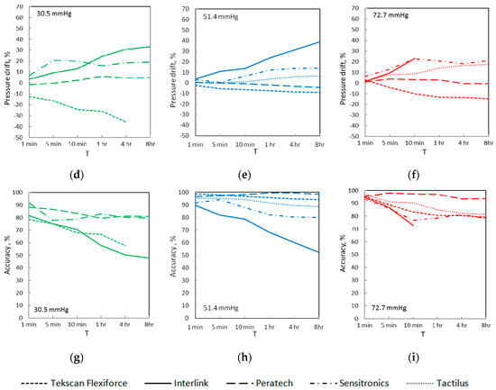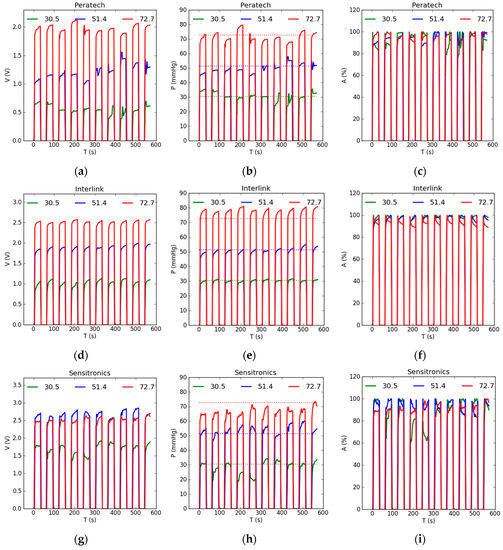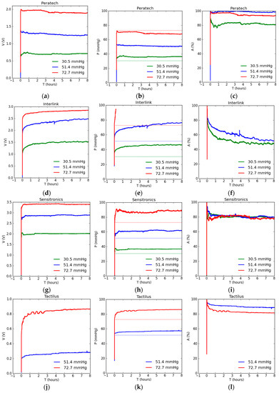 Accuracy comparisons for all the sensors are shown in Figure 7g,h,i and Table 3. The best results were achieved at 51.2 mmHg for Peratech, followed by Tekscan Flexiforce and Tactilus. At 30.5 mmHg, Peratech and Sensitronics achieved better accuracy than other sensors, which was, however, lower than at 51.2 mmHg. Accuracy at 72.7 mmHg was intermediate between medium and lower pressure levels. Noise in the measurement system was also estimated from the results. In the absence of any applied pressure, noise level in the system was on the order of 10−5 V; with the pressure applied to the sensors, noise levels increased to the order of 10−3 V, which would be the resolution limit for the system.