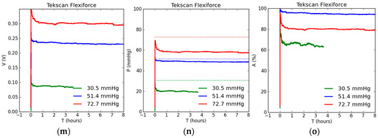 Figure 6b,e,h,k,n shows pressure results obtained with reference to the calibration file, and demonstrates that they are affected by the calibration method and its accuracy. Pressure readings follow the same drift patterns displayed by output voltage readings. The larger the number of calibration points and the number of calibration readings at each pressure point, the greater the similarity between the pressure and voltage outputs of the sensor. However, there can still be differences caused due to inherent pressure vs voltage non-linearity in sensor output, noise in the measurement system and repeatability of the sensor response between consecutive measurements. Comparing pressure readings to actually applied gold standard pressures of 30.5, 51.4 and 72.7 mmHg, shown by the dotted lines, reveals that the most accurate pressure readings were achieved for all sensors, except Interlink, at an intermediate value of 51.4 mmHg. The Tactilus sensor exhibited no response at 30.5 mmHg of applied pressure, suggesting it has a threshold pressure below which it does not operate. Tekscan Flexiforce sensor readings were less than applied values for all pressures, Tactilus, Interlink and Sensitronics measured values were larger than applied for all pressures, and Peratech exhibited higher measured values for lower pressures, lower measured values for high pressures and very accurate values for medium pressure. It was also observed that at the loading test point of 72.7 mmHg, the voltage readings for Interlink sensor had drifted beyond the maximum calibrated pressure values within 20 min of applied load. It subsequently displayed only a straight line representing the maximum calibrated pressure reading of 94.03 mmHg and hence in Figure 6e,f the curve is presented only till the point where the curve showed calibrated pressure measurements. In contrast, pressure readings at 30.5 mmHg for Tekscan Flexiforce sensor drifted below the minimum calibrated pressure readings of 17.63 mmHg after about 3.5 h and so in Figure 6m,n,o only the reading till the point where the curve showed calibrated pressure measurements is shown.