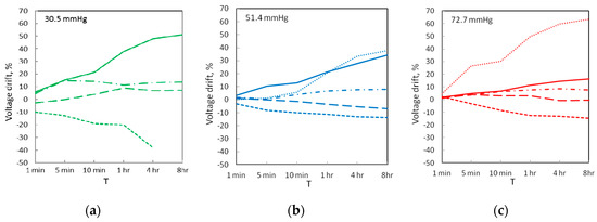 where Vf and Pf are voltage and pressure at the final moment over which the pressure is applied, and Vi and Pi are voltage and pressure at the initial moment in time when rate of change of the output has reduced sufficiently to be considered steady state. Twenty-six seconds initial time was selected, as all sensors reach a steady state by this time. Drift was calculated for static measurements at 1 min, 5 min, 10 min, 1 h, 4 h and 8 h from the time of pressure application.