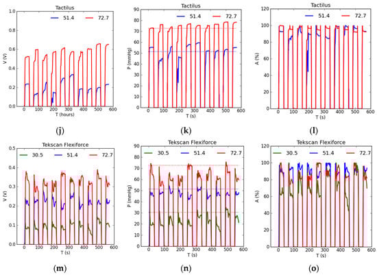 Figure 8b,e,h,k,n shows pressure results obtained from the calibration file. They follow the same change patterns displayed by output voltage readings. Very good agreement between measured pressure readings and applied gold standard pressures of 30.5 and 51.4 mmHg, shown by the dotted lines, was achieved. This could be attributed to matching timings of 30 s for both calibration and measurement. However, for higher pressure of 72.7 mmHg, the least agreement was demonstrated for most of the sensors; the Tekscan Flexiforce and Sensitronics underestimated the pressure and the Interlink and Tactilus overestimated the pressure.