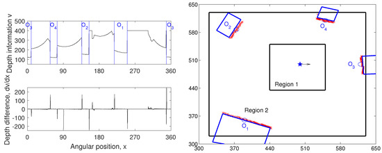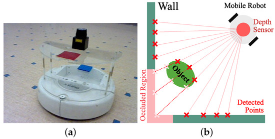 x marks with an interval of angular resolution indicate detection points. In addition, one object makes some occlusion area on the wall which is marked in pink. The depth sensor has a distance accuracy of 5 mm (within a range of 60–1000 mm) or 30 mm (within a range of 1000–4095 mm) and an angular resolution of about 0.36