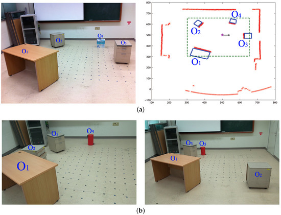 In fact, there is no significant difference between the DELV method and its weighted vector method as shown in the vector map results. The DELV method may lose some landmarks in an environment in the feature extraction process. If a landmark area is relatively small (i.e., the angular size is smaller than 5), it is filtered out. If the landmark area has a distance larger than 550 cm, it is regarded as a wall, and it is not selected as a landmark.