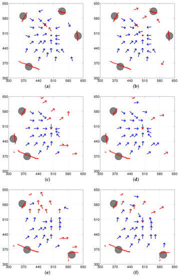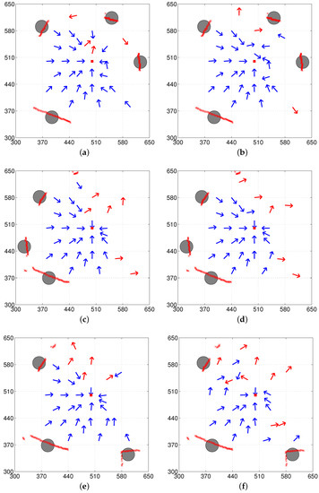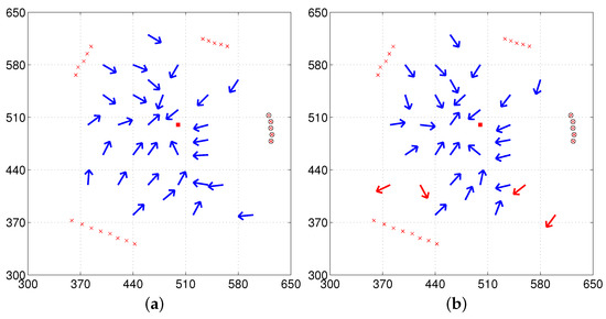 Figure 6 indicate selected landmark vectors at the home location, which is then stored as the reference map. The center of each circle indicates the end point of the actual landmark vector from home and the radius of the circle is arbitrarily set for the graphical representation. At each location, the landmarks were extracted and represented as the corresponding landmark vectors in order to estimate the homing vector. The direction of the arrows in the vector map indicates the decided homing direction at each point while the red square at (500, 500) indicates the home location. Blue and red arrows in the vector maps indicate angular errors with a positive sign to return home [−90