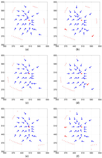 Figure 6b,d,f show the result without the reference compass. The homing navigation algorithm requires estimating the heading direction and the arrangement order among all possible heading directions and arrangement orders. With the reference compass, the method can reduce the computational cost to estimate the current heading direction using the distance map, and one task of finding the appropriate landmark arrangement order still remains. The vector maps shown in