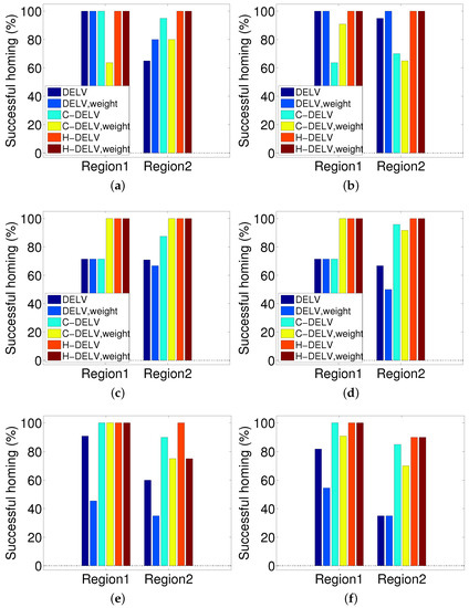 Figure 11. The angular error increases as the distance from home increases. As a result, the success rate decreases as the robot is farther away from home location. Interestingly, the H-DELV method shows the highest success rate in homing. The DELV and C-DELV methods do not show good performance in homing even though they have similar level of angular errors in
