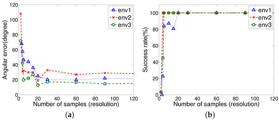 Figure 6a has an angular error of almost 180 degrees near the point (510, 520). Thus, we counted the number of robot positions with relatively small angular errors, that is, within the range of [