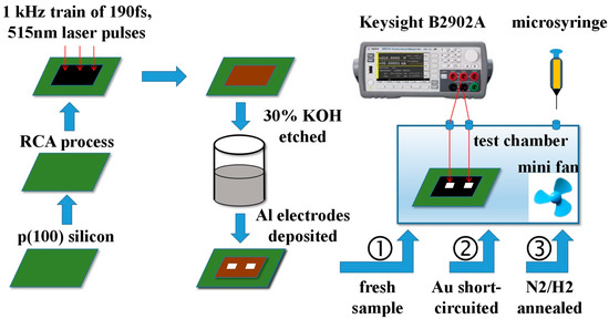 To measure the sensor response in NH3 gas, a sensing test system is set up. The sensor is placed in a sealed organic glass test chamber in a constant RT/RH laboratory. The test chamber is filled with clean air before sensing measurement. The sensor’s contacts are made an electrical connection with two silver test probes. A stirring mini-fan inside the chamber is used to promote the uniformity of the gas mixture. A predetermined amount of pure gas is injected into the chamber directly by a micro-injector to obtain the desired concentration, which is calculated from the volume ratio of pure NH3 to test chamber according to the static volumetric method [30]. Dynamic resistance during sensing measurement is transferred to a PC by using a precision measurement unit (B2902A, Keysight Technologies Inc., Santa Rosa, CA, USA). The schematic diagram of sensor fabrication and testing is shown in Figure 2.