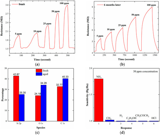 Dynamic response of (a) Fresh sample and (b) sample stored in air for 6 months versus NH3 concentrations ranging from 5 to 100 ppm. (c) The proportion of Si 2p, O 1s and C 1s species in the sample before and after ageing. (d) Selectivity of the sensor for 50 ppm NH3, CH4, H2, C2H5OH, CH3COCH3 and HCl.