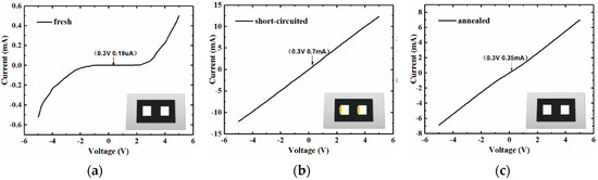 I-V curves of (a) freshly prepared, (b) short-circuited and (c) annealed sensors.