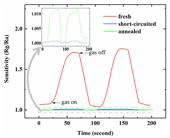 The NH3 response of the freshly prepared and treated sensors at 50 ppm concentration are exhibited in Figure 6. Unexpectedly, the gas sensitivity declines drastically to <~1.015 for either treated devices. The inset of Figure 6 suggests that the sensors after treatment still show a very weak response to NH3, and this vestigial response mainly results from the semiconducting property of the pristine Si material. Furthernore, the annealed sensitivity is higher than the short-circuited one, this phenomenon is probably due to the incomplete Ohmic annealing process as revealed in Figure 4c.