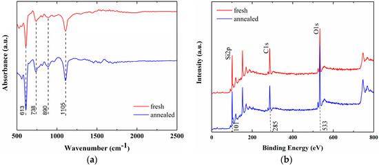 Spectra of (a) FTIR and (b) XPS obtained from freshly prepared and annealed sample.