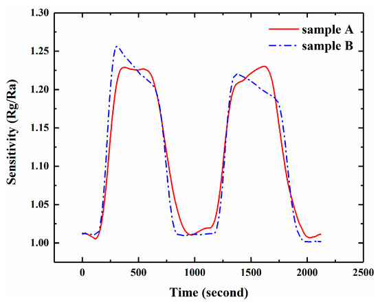 Finally, we also investigate the effective adsorption sites for gas response on the sensor by conducting a contrast experiment. The experiment is carried out with two sensors: one is the freshly prepared device (sample A), and the other is the device with vaseline coating on the surface of the electrodes (sample B). NH3 response at 5 ppm concentration for the two samples is shown in Figure 8. and no essential sensing disparity can be found. This result indicates that the effective adsorption sites in the sensor occur only on the interface between the gas and the silicon surface, not on either the Al electrodes or on the Al-Si Schottky junction.