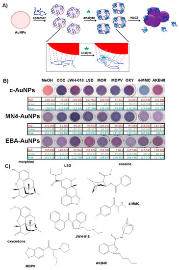 36]. We hypothesized that the affinity of the AuNPs for different chemical moieties can provide a tool to design a sensor platform that can respond to different molecules. The controlled substances studied here (see