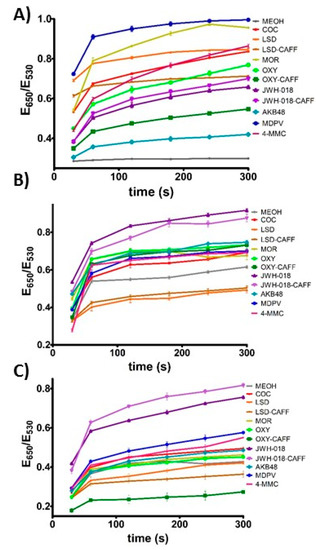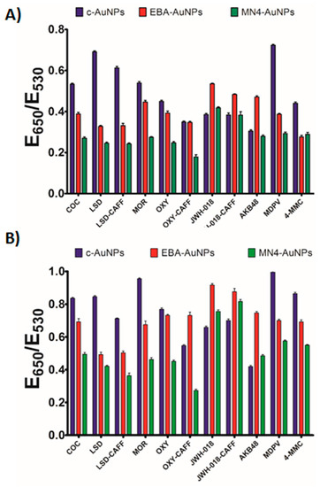 25], providing a tool to detect multiple targets with different affinities. As expected, different levels of response were observed when the EBA-AuNPs were exposed to the different controlled substances, as shown in the digital image in