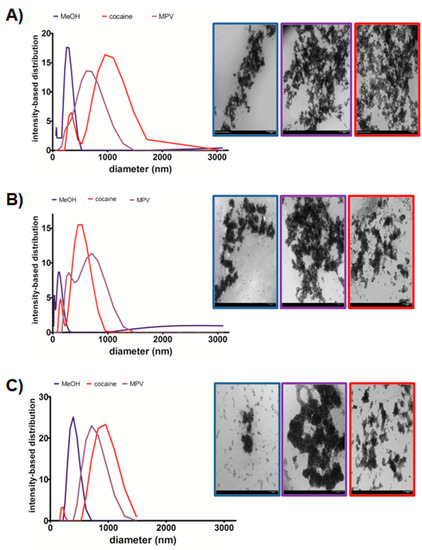 To confirm that the plasmonic response observed in the assay was due to analyte-binding triggered AuNP aggregation, we studied the mechanism of the color response by DLS. The NaCl concentration used in the DLS experiments was lower than in the assay, to keep a slow aggregation pace and facilitate the tracking of the AuNPs size changes during the analyte addition and salt-induced aggregation steps. The AuNPs were exposed to methanol, cocaine, or MDPV, and incubated for 15 min, followed by the NaCl addition. The size distribution plots in
