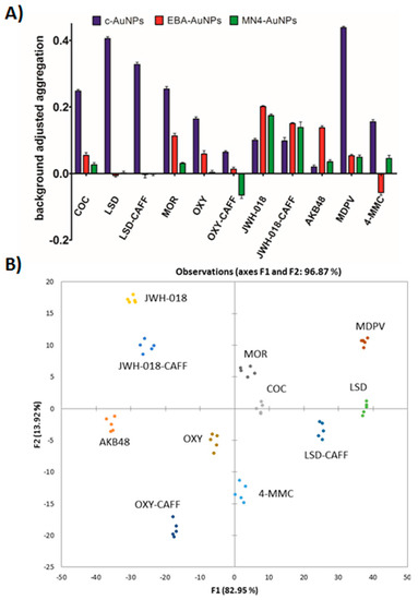 27]. We applied the same rationale to the plasmonic fingerprint obtained in this work with the aim of identifying whether the sample of interest is one of the eight illicit drugs studied. Our initial analysis demonstrated that discriminant analysis (DA) provided more compact clusters and better inter-cluster separation, as compared to the PCA [