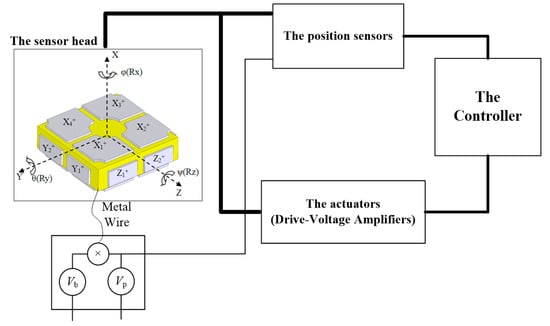 A schematic of the HUST closed-loop electrostatic accelerometer is shown in Figure 2. It consists of a sensor head, a displacement transducer, a controller, and an actuator. The sensor head consists of a PM and the surrounding electrode cage, where the six-degree-of-freedom (DoF) motions of the PM with respect to the electrode cage are measured by a six-channel capacitive displacement transducer, and then the low-frequency feedback voltages calculated from the controller are applied on the electrodes by drive-voltage amplifiers. Finally, the PM is controlled motionlessly with respect to the cage. In this case, the feedback voltage could indicate the differential forces acting on the PM and satellite, so that we can obtain the gravitational gradient or the non-gravitational forces acting on the satellite, such as air drag and light pressure. Here, a direct DC bias voltage, Vb, and a high-frequency (i.e., 50–100 kHz) pumping voltage, Vp, are applied to the PM by a soft metal wire, which help to linearize the electrostatic actuator and drive the capacitance transform bridge, respectively.