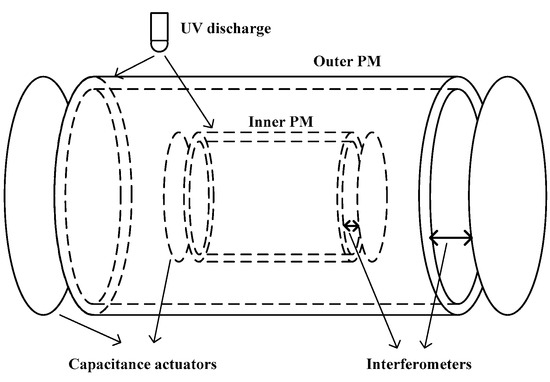 The TEPO project was proposed to test the EP at the level of 10−17 for different composition bodies by HUST, in which the technologies used in the MICROSCOPE and LISA Pathfinder, such as the heterodyne laser interferometer, precision electrostatic accelerometers, and the ultraviolet (UV) charge management system, are expected to be adopted [15]. In the TEPO mission, the PMs are designed to be hollow concentric cylinders, the same seminal design as in the MICROSCOPE mission, with an outer titanium PM and an inner platinum PM. The relative motion of the two PMs in the sensitive axis, which are affected by the possible EP violation, are monitored by a laser heterodyne interferometer, and then controlled to be motionless by electrostatic actuators, as shown in Figure 4. Instead of the gold wires employed in the MICROSCOPE mission, a UV discharge system, as developed and tested with the GP-B [41] and LISA Pathfinder [12] proof masses, is used to discharge the PMs based on the photoemission effect, which can avoid the damping of the gold wires. Based on detailed analysis and theoretical calculations, the accuracy of the TEPO project based on the best level of the technologies mentioned above is estimated, and the results show that the resolution of the differential acceleration could reach 1.9 × 10−13 m/s2/Hz1/2 at a frequency of 1 mHz; the EP could be tested at 8 × 10−17 with a 1-d integration.