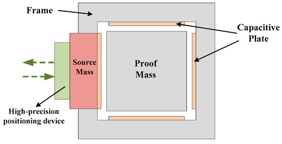 The Test of the Inverse-Square-law in Space (TISS) project was proposed in 2006 to test the Newtonian gravitational law and to search for new interactions in a sub-millimeter range by an electrostatic accelerometer [14]. A schematic of the TISS project is shown in Figure 5. The proof mass is attached to the middle of the frame, and the source mass is fixed on a high-precision positioning device such as a piezoelectric transducer (PZT) platform. Six-degree-of-freedom capacitive sensors are used to detect the distance between the source mass and the PM, and then feedback voltages are applied on the capacitive plates, which makes the PM maintain its initial equilibrium position. The feedback voltages can represent the gravitational force of the PM attracted by the source mass. When the distance varies, the feedback voltage varies as well, and changes in the Newtonian gravity force can be calculated. The theoretical calculation showed that the strength factor α for the general Yukawa’s potential can be tested lower than the 105 at the μm level range [14], when the resolution of the electrostatic accelerometer reaches 3 × 10−10 m/s2/Hz1/2 and the minimum distance between the source mass and PM can be periodically driven from 20 to 10 μm with a period of approximately 10–100 s. In this case, the result can be improved by a factor of 5–10 compared with current terrestrial experimental results.
