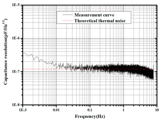 A precise capacitive transducer based on a differential transform bridge and the Field-Programmable Gate Array (FPGA) technique has been carefully studied and developed [48], and currently, the noise level has increased to 1.6 × 10−7 pF/Hz1/2 down to 1 mHz [49], which is limited by the thermal noise of the front-end electronics as shown in Figure 6; this can satisfy the requirement of the displacement measurement for a 10−12 m/s2/Hz1/2-level accelerometer and is also suitable for position measurement of the PM in the TianQin project.