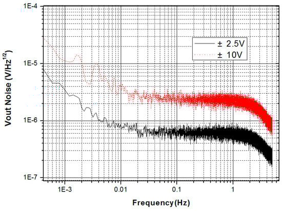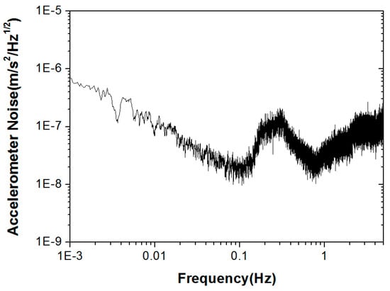 In general, the output voltage noise for the electrostatic accelerometer is at a level of 10 μV/Hz1/2, which is limited by the quantum noise of a 16-bit digital-to-analog converter (DAC) and the thermal noise of a voltage-driven amplifier. To suppress the output noise, a direct voltage readout scheme is adopted using a high-precision analog-to-digital converter (ADC) (i.e., 20 bits or better) to measure the voltage applied on the control electrodes, which can suppress the electric and quantum noises of the DAC and voltage-driven amplifier due to the large open loop gain in the frequency band of interest. A voltage readout noise of approximately 2 μV/Hz1/2 was realized using this scheme [50]. Figure 7 shows that a noise level of approximately 0.6 μV/Hz1/2 was realized using a 24-bit ADC in the ±2.5 V range.