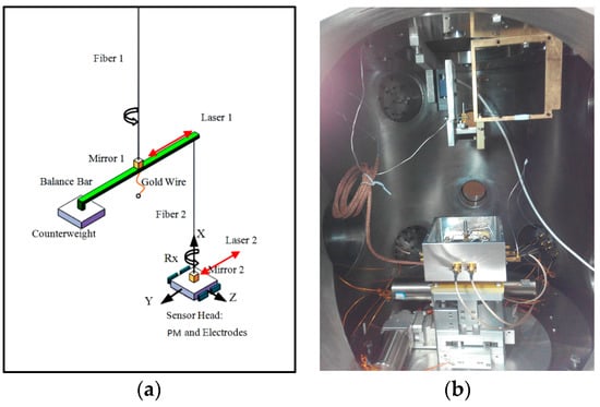 A one-stage electrostatically controlled torsion balance consisting of a PM and a counterweight connected to a balance bar, as shown in Figure 10, has a higher sensitivity along the horizontal direction. It is sensitive to the force actuated on the entire PM. Because of good suppression of seismic noise coupling along the sensitive axis in closed-loop control, it has been engaged to investigate the highly sensitive translational axis of the accelerometer.