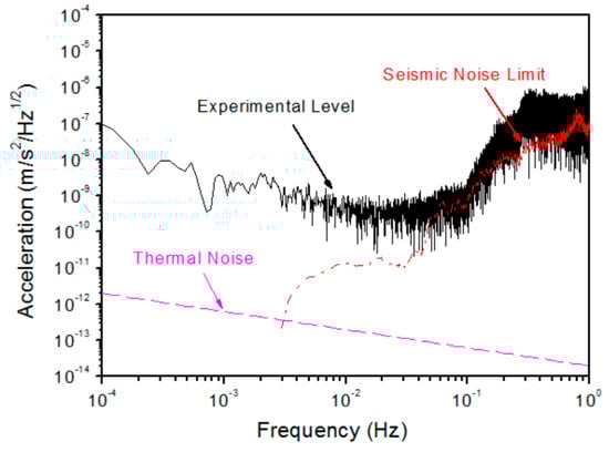The high-levitation-voltage method is proposed to test various six-DOF control strategies, and it is also suitable for testing the engineering and flight models of accelerometers for space missions. At HUST, a titanium-alloy PM weighing approximately 70 g with a vertical gap of approximately 50 μm was levitated by a simple high-voltage actuator with an output range up to 900 V and a frequency bandwidth of 11 kHz, which is realized by an operational amplifier and a metal-oxide-semiconductor field-effect-transistor (MOSFET) combination [51]. The translation noise of the accelerometer increased to approximately 2 × 10−8 m/s2/Hz1/2 at 0.1 Hz, as shown in Figure 8, but is limited by seismic noise.