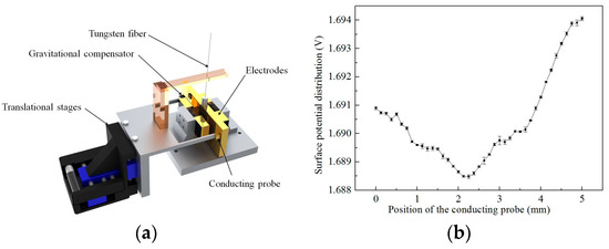 Meanwhile, we have also presented an electrostatically-controlled torsion pendulum with a scanning conducting probe to measure the charge distribution and its variation with better precision and higher resolution. The schematic of this novel scheme is shown in Figure 13a; this scheme combines the scanning capability of the Kelvin probe and the high precision of the torsion pendulum. Temporal variation of the surface potential can be measured at a level of 15 μV/Hz1/2 at 0.03 Hz, and the surface-potential distribution can be obtained at a level of 330 μV at a 0.125-mm spatial resolution, as shown in Figure 13b [57].