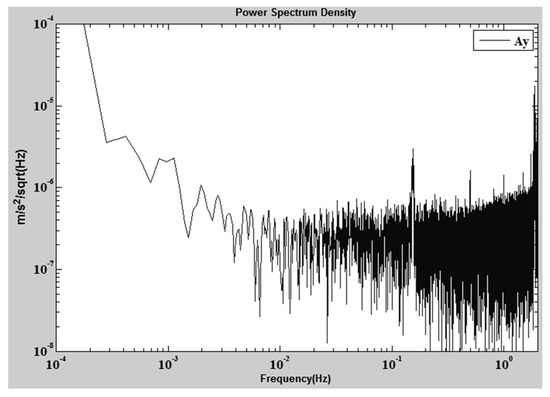 The in-orbit data show that the six-DOF motions of the PM are always controlled within approximately 10 nm/Hz1/2 at 1 Hz. Meanwhile, we use the in-orbit data to estimate the relative distance between the center-of-mass (CoM) of the accelerometer and the satellite. The basic method is to compare the output of the accelerometer with the gyroscope data during attitude maneuvering, where the accelerometer is influenced mainly by the centrifugal acceleration and the linear acceleration induced from angular motion. A least square estimation method is used to estimate the three coordinate components of the CoM, and a position-estimation accuracy of approximately 6 mm is achieved [59]. During the in-orbit test, the noise level of the sensitive axis of the accelerometer, in the normal direction of the satellite’s orbital plane, is typically shown as in Figure 15. The noise level is approximately 1 order higher than the ground level. From a simulation analysis, the increase of the noise level is mainly the spectrum leakage effect from the satellite high-frequency accelerations due to the nonlinearity and the decimation aliasing effect of the accelerometer.