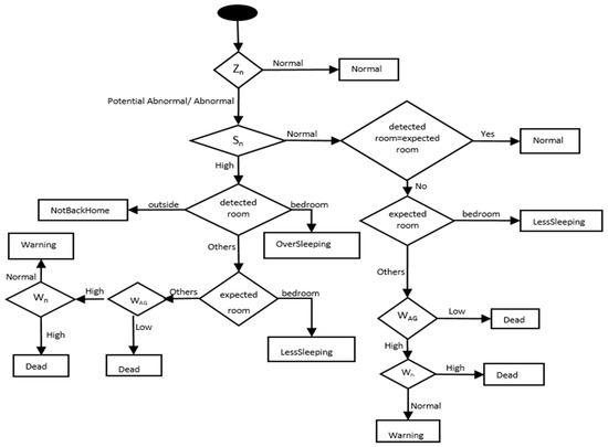 - Sn: represents the classification of the detected longest continuous stay (Normal or High). The detected longest stay is “Normal” if its value is less than the expected longest stay value from the model; otherwise, it is “High”.