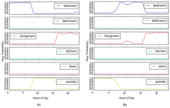 | Profile for a “Morning person” who usually sleeps as most of the people from midnight until morning (hours 0–8) and goes outside during the day (hours 8–16) and also does some domestics activities in the living room in the evening. | Profile for a “Nightly person” who usually goes outside in midnight and sleeps during the morning and afternoon (hours 8–16), and then performs some domestics activities in the living room during the evening (hours 16–23) |