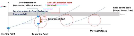 A single use of the IMU-based dead reckoning has a characteristic error generation pattern—accumulation of error. The dead-reckoned tracking is accurate in the beginning, however, the errors from the truth accumulate over time because of the noise in the mobile sensors. Periodic error calibrations are necessary to maintain the quality of estimation. Figure 1 illustrates the error generation characteristics of an IMU after appropriate calibration.