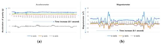 Accelerator/magnetometer fluctuation pattern corresponding to elevator: (a) Accelerometer, (b) magnetometer.