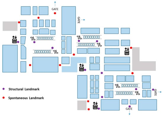 Next, we extended the landmark calibration method to a commercial department store located in Incheon, Korea. The floor area of the target floor is 9428 m2. Three escalators and four elevators are included in the target floor. In addition, the corners are included over the seventy places in the target floor (see Figure 3).