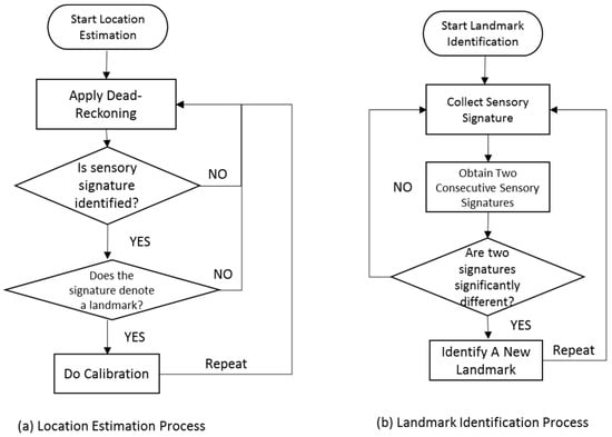 The ground truths that are used to localize the spontaneous landmarks are collected by voluntary activities. A simple sensory signature gathering application generates an alarm whenever distinct sensory signatures are detected. A user can record the geographical ground truths for the detected signatures by pinpointing over the floor plan. In addition, the ground truth can be estimated by the autonomous actions of a sensory signature gathering application. The sensory signature gathering application automatically records the current location obtained by dead reckoning for a detected signature. The autonomous recording has a relatively large error compared to voluntary pinpointing. For the estimation of a location by dead reckoning, repetitive collection and averaging can reduce the error of the ground truth estimation. Figure 4 illustrates the entire process of landmark identification and location estimation. The identified landmarks are continuously used for recalibration. Periodic recalibration can achieve an acceptable upper bound of location errors.