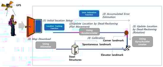 Sensor-based location estimation is another general approach for indoor spaces. An inertial measurement unit (IMU) that is embodied in every smart device measures the velocity, orientation, and acceleration of the device. Using the IMU, we can estimate the movement of objects. This estimation method is named dead reckoning [,,,,]. By using the pedestrian working model, we can estimate the movement or orientation of a device without any infrastructure. Fuchs et al. identified the common requirements of indoor tracking in mission critical scenarios and introduced the basic techniques for IMU location estimation []. Beauregard et al. proposed a combined approach of pedestrian dead reckoning and GPS location estimation []. An accelerometer provides signals and a neural network predicts the step length for relative indoor positioning. Jiménez et al. used a low-performance micro-electro-mechanical sensor (MEMS) attached to the foot of a person []. This sensor has a triaxial accelerometer, a gyroscope, and a magnetometer. They implemented and compared most relevant techniques for user movement such as step detection, stride estimation, etc.