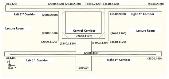 To demonstrate the practical usability of the proposed landmark calibration method, we identified the structural and spontaneous landmarks for two different types of buildings. A large area cannot be appropriate to test and enhance the applicability of the landmark identifying process. Thus, we first apply the developed similarity test in a relatively small area. The test area is the second floor of a college building. Figure 6 illustrates the details of the floor. The bottom-left point is the origin of the coordinates. The distances from the origin are represented in centimeters. To identify the landmarks, we repeatedly wander around the test floor. After the determination of landmarks, we measure the location estimation error for total seven paths. Each path has ten location measuring points.