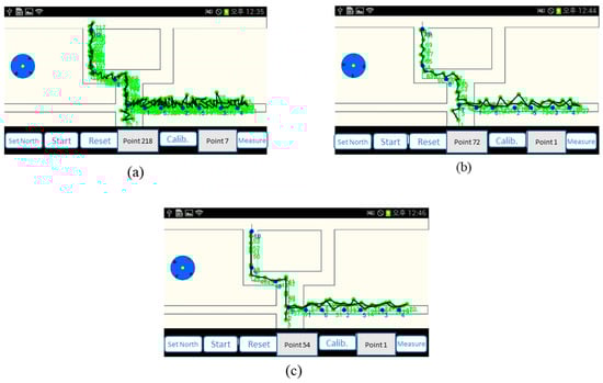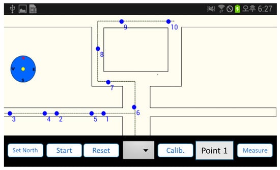 The similarity test processes on two time-consecutive sensory signatures (one signature is measured at time and the other is measured at ). The difference of two signatures (i.e., in Section 2.2) is normally distributed with mean and unit variance (i.e., ). Then, we apply as a useful threshold value. The constant value, , determines the strictness of the similarity test. Suppose that is equal to 1, the two sensory signatures are determined to be statistically different only when they have a difference belonging to the upper 15.8% of the difference distribution. In the cases of and , we consider the upper 6.7% and 2.2% of the total difference distribution as the similarity threshold, respectively. In this experiment, we indicate the results corresponding to 1, 1.5, and 2 to demonstrate the usefulness of the similarity test. A mobile application tool is developed for the test. The application obtains the landmarks, sets up a test path, and performs dead reckoning with calibration as shown in Figure 7.
