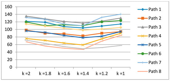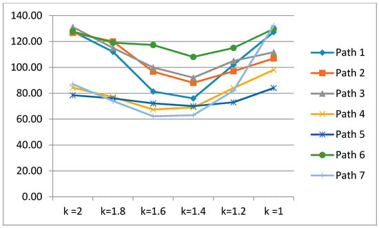 Figure 9 illustrates the patterns of location errors for each experimental path. Location errors are minimized at the median of k. We expand the value into {1, 1.2, 1.4, 1.6, 1.8, 2} to enhance the visibility of the trends. If 1.2, we consider the upper 11.5% of the total difference distribution as the similarity threshold. Similarly, upper 8.1% when 1.4, 5.5% when 1.6, and 3.6% when 1.8 are considered to similarity thresholds.