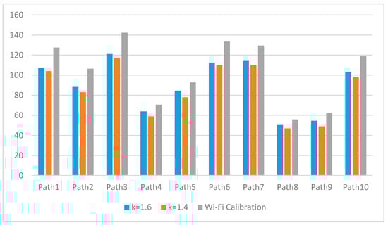 Figure 11 illustrates the patterns of location errors for each experimental path. The median of k minimizes the location errors. The results of the calibration method using a Wi-Fi system [,] are illustrated in Figure 12 to show the excellence of the proposed method. The number of Wi-Fi recalibrations are slightly different for each test path: the maximum number of recalibration is 27 times for path 10 and the minimum is 11 times for path 1. Figure 12 shows the performance comparisons of Wi-Fi calibration and the proposed autonomous landmark calibration (k = 1.4 and k = 1.6). The proposed method illustrates the superior results for average 17.8% enhancement.