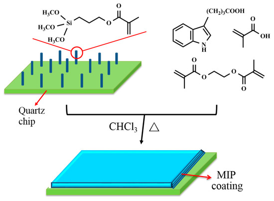 Each molecularly imprinted polymer-coated quartz chip was prepared according to the reported method, with minor modifications [27]. Briefly, 0.102 g of IBA (template) was placed in a glass vial and completely dissolved in 11.3 mL of chloroform (solvent), and then 0.172 g of MAA (monomer), 1.584 g of EGDMA (cross-linker), and 0.016 g of AIBN (initiator) were added. The prepolymer solution was sonicated for 10 min. Subsequently, a silylated chip was inserted into the solution and was deoxygenized with a stream of nitrogen for 10 min. The vial was sealed and placed in an oil bath for polymerization at 50 °C for 6 h. Next, the chip was pulled out carefully, resulting in a thin layer of the MIP coating on the quartz chip surface. This MIP-coated chip was placed in another empty vial filled with N2 and then heated to 60 °C for 24 h to cure the coating. The coated chip was eluted with a 10% (v/v) acetic acid methanol solution to remove the template until it could not be detected via a UV spectrophotometer. Five repetitions of the coating procedures were performed. A non-imprinted polymer (NIP)-coated chip was prepared simultaneously according to the same procedure described above but without adding the template (IBA).